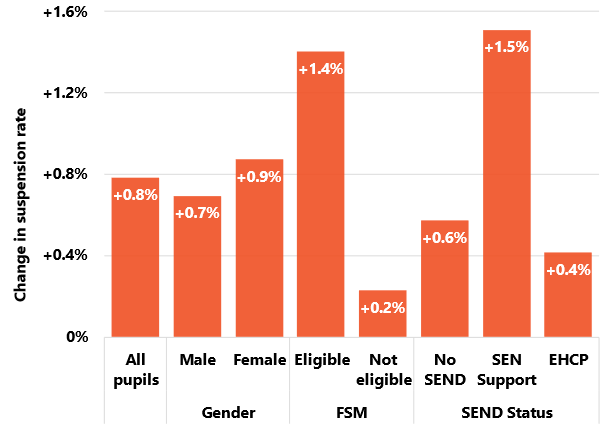 - The overall suspension rate for all pupils across England has risen by 0.8% points since the Covid-19 pandemic