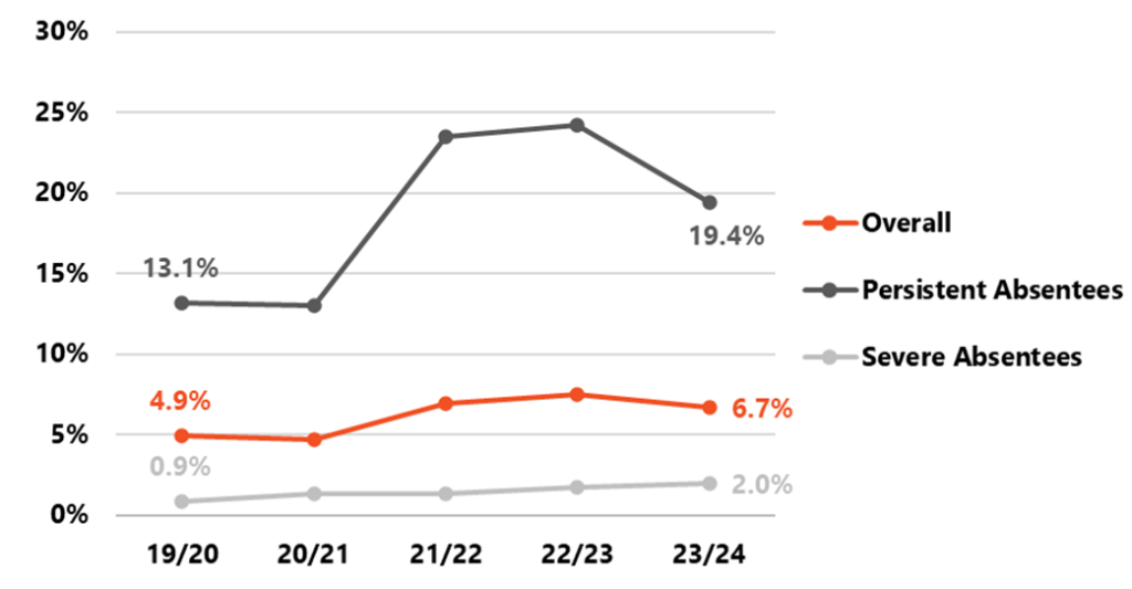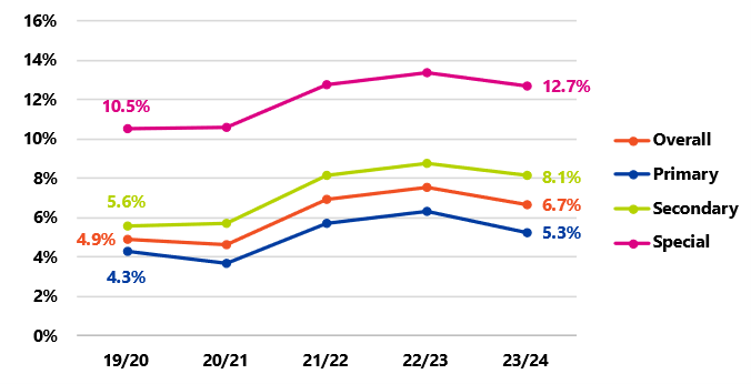 - The overall absence rate across England is beginning to fall following consecutive post-pandemic increases, now down to 6.7% in the 2023/24 autumn term