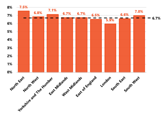 - Overall absence rates remain highest in the North East of England at 7.5%, while they are lowest in London at 5.9%