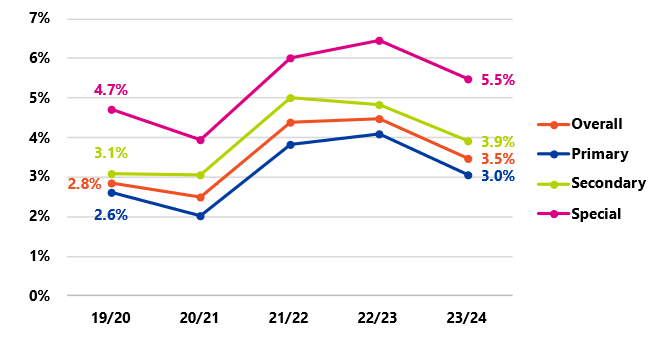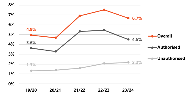 - Unauthorised absence continues to increase, now at 2.2% in 2023/24, and is largely driven by unauthorised absences in secondary schools