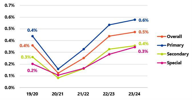 Another interesting trend that has arisen in our analysis of the newly published data is the increasing rate of sessions being missed as a result of unauthorised holidays. As a result of the Covid-19 pandemic, we saw a large drop in the proportion of sessions missed due to unauthorised holiday across all phases between the 2019/20 and 2020/21 autumn terms however, since then, we have seen consecutive increases up to greater proportions than were seen pre-pandemic. For example, in state-funded primary schools, 0.4% of all sessions were missed due to unauthorised holidays in 2019/20 but this has now risen by to 0.6% in 2023/24. With the ongoing cost of living crisis affecting England, we wonder whether this may be a result of an increased number of parents taking their children on holiday outside of the school holidays where costs are lower and holidays more affordable.