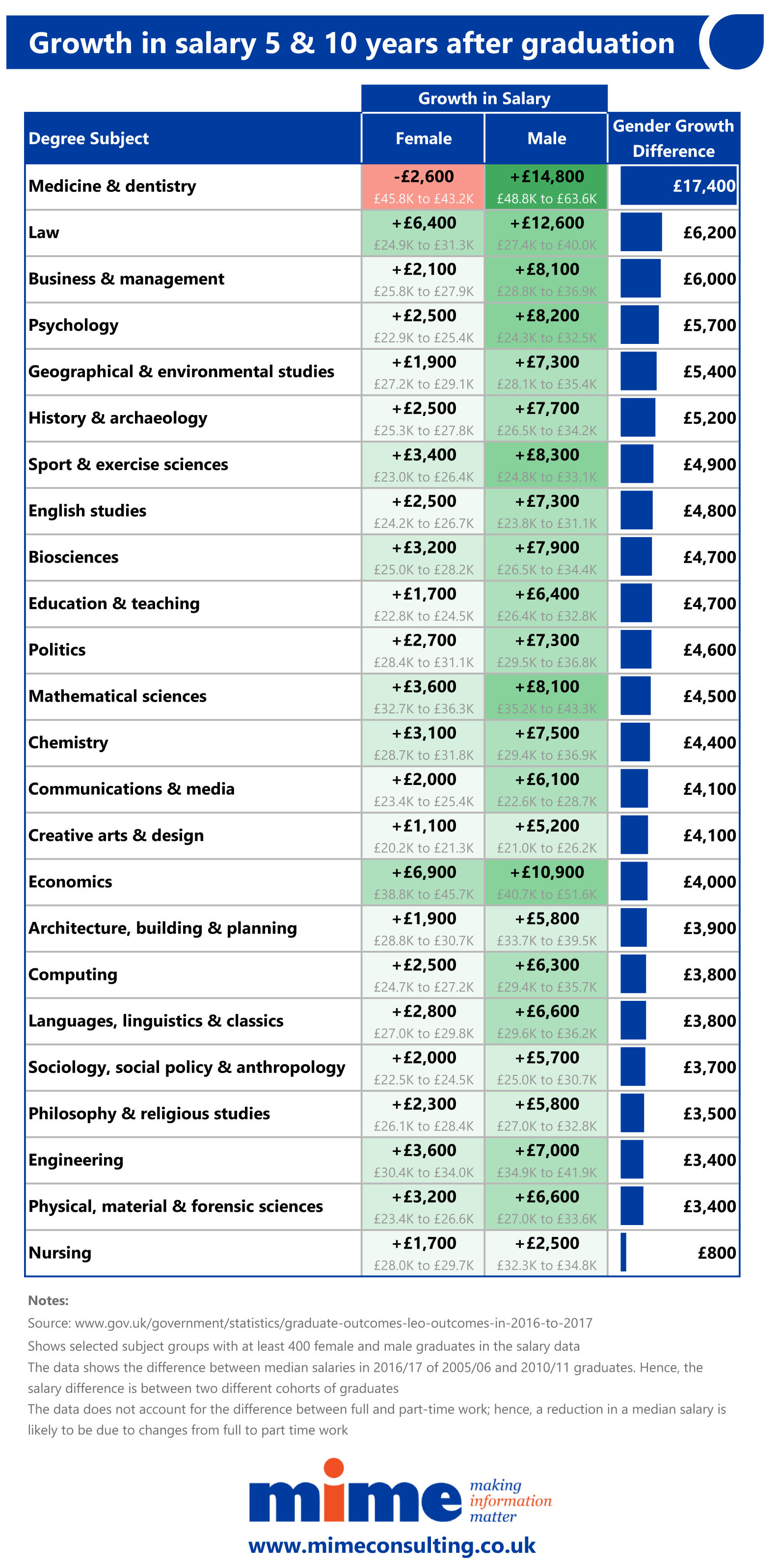 - The biggest gap between male and female pay change is for medicine and dentistry graduates. The median man’s salary increases by £14,800 over five years while the woman’s drops by £2,600. After 10 years the difference between the two is vast – £17,400. Is this a particular issue with part-time work for female doctors and dentists or diverging career paths?