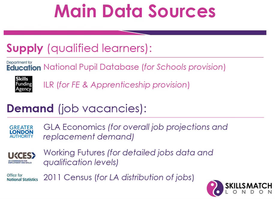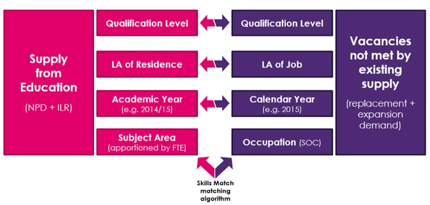 - Researching available datasets that could be used to identify skills mismatches between post-16 school and college provision, and industry labour market growth. The datasets we identified are shown here. One addition to the existing data, was creating a third tier of the Sector Subject Area classification; this was needed since the second tier had such a wide range of subjects they were very hard to tag to individual occupations, but going to a specific qualification level was unsustainable, given the tens of thousands of qualifications