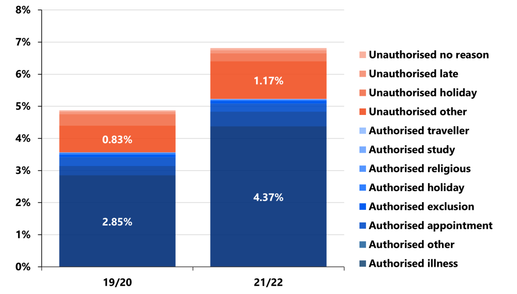 - Unauthorised absence has risen by 0.3% points since before the Covid-19 pandemic