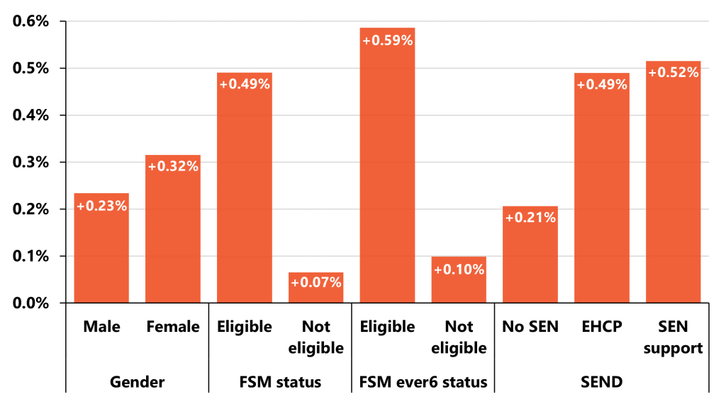 - Pupils with EHCPs, or those requiring SEN support, missed 0.3% more sessions due to unauthorised reasons compared to pupils with no identified SEN.
